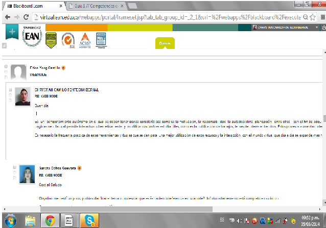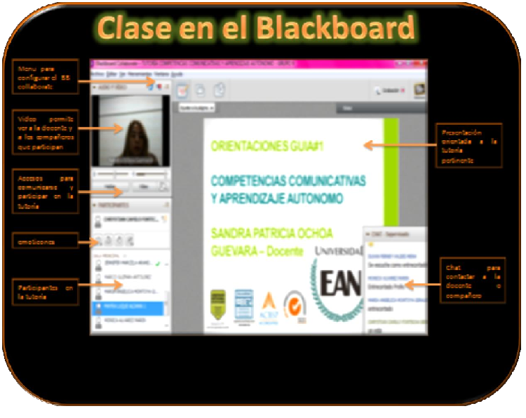 El sistema Blackboard collaborate es una herramienta que se utiliza virtualmente con el fin de guiar y solucionar dudas sobre la materia que se desarrolla compartiendo opiniones, conocimientos entre la docente y los estudiantes.