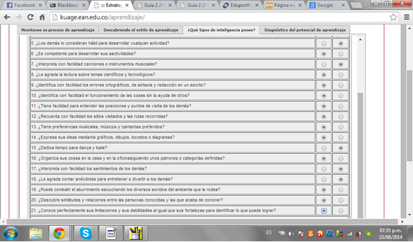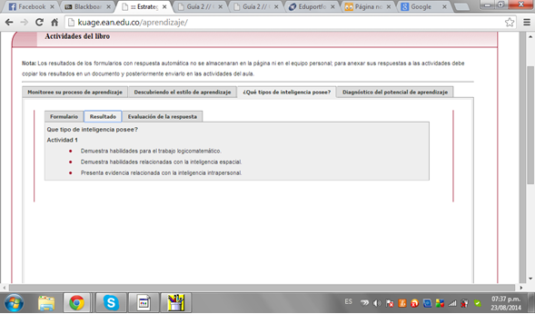 Según la matriz la inteligencias que más desarrolladas poseo son 3; el trabajo logicotematico, inteligencia espacial e inteligencia intrapersonal. Aunque son fuentes importantes de conocimiento es necesario trabajar más en ellas y las demás inteligencias de niveles inferiores como es la lingüística y la musical.